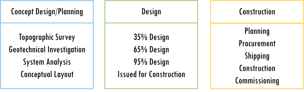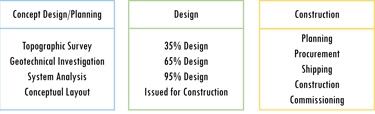First service projects are complex and challenging projects that require several years to complete. Typically, first service projects are broken into smaller projects that are phased over time. Each project follows the timeline shown below.